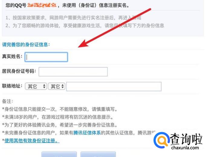 输入自己进入游戏的QQ账号,如果还没有实名认证的,则会显示如图的信息,我们需要输入自己的姓名和身份证信息。然后点击下方的按钮。
