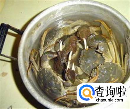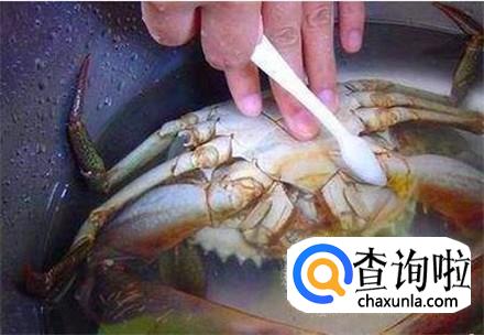 盆里倒上清水,加上一把食盐溶化,然后把螃蟹放进去浸泡半小时,这样螃蟹肚子里的脏东西能够吐出来。