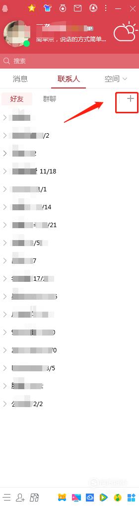 先在电脑上登录QQ,选择联系人下方的“+”图标。