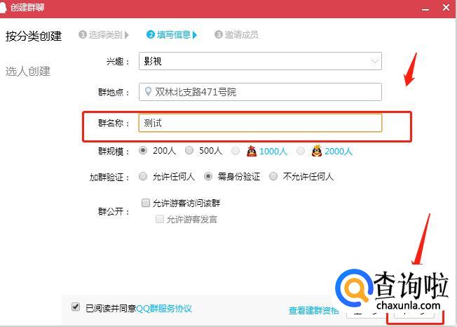 依次填写好群名称,群规模、加群验证、群公开等信息,可以不用填写,直接使用默认选项,随后点击【下一步】。
