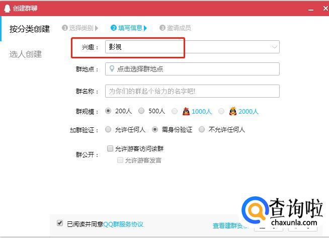 群信息填写,在具体兴趣栏选择“影视”。