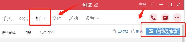 进入群对话框页面,点击聊天选项右边的【相册】菜单,再点击【上传照片】。