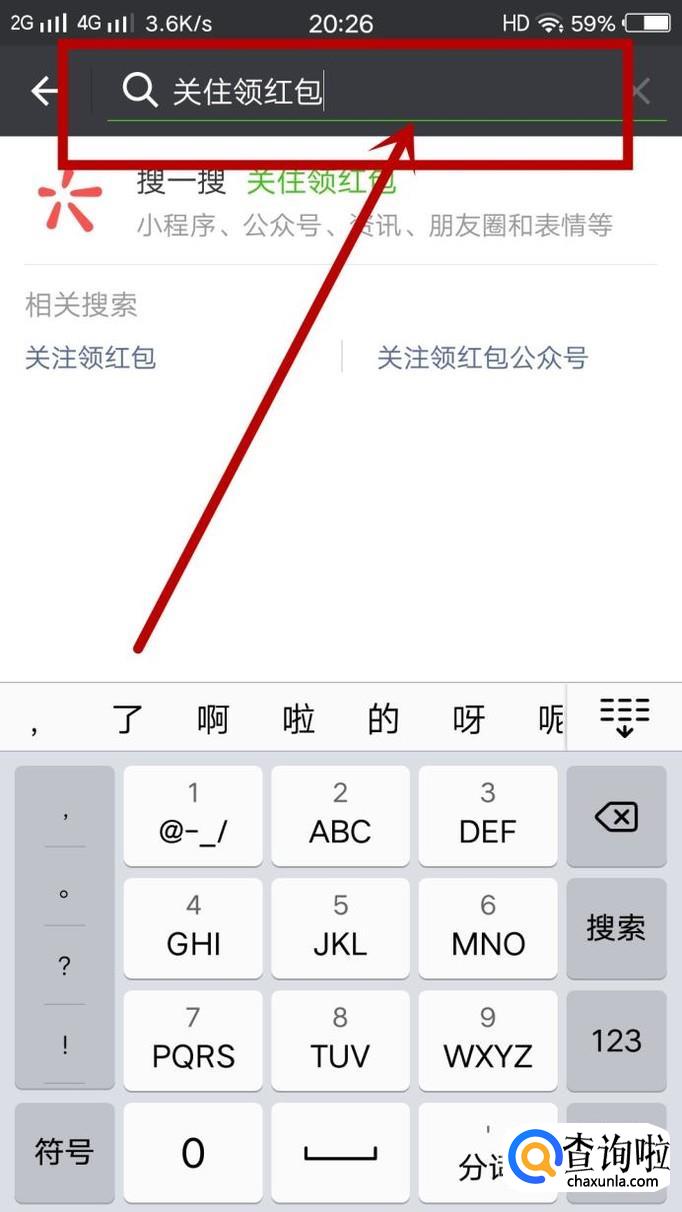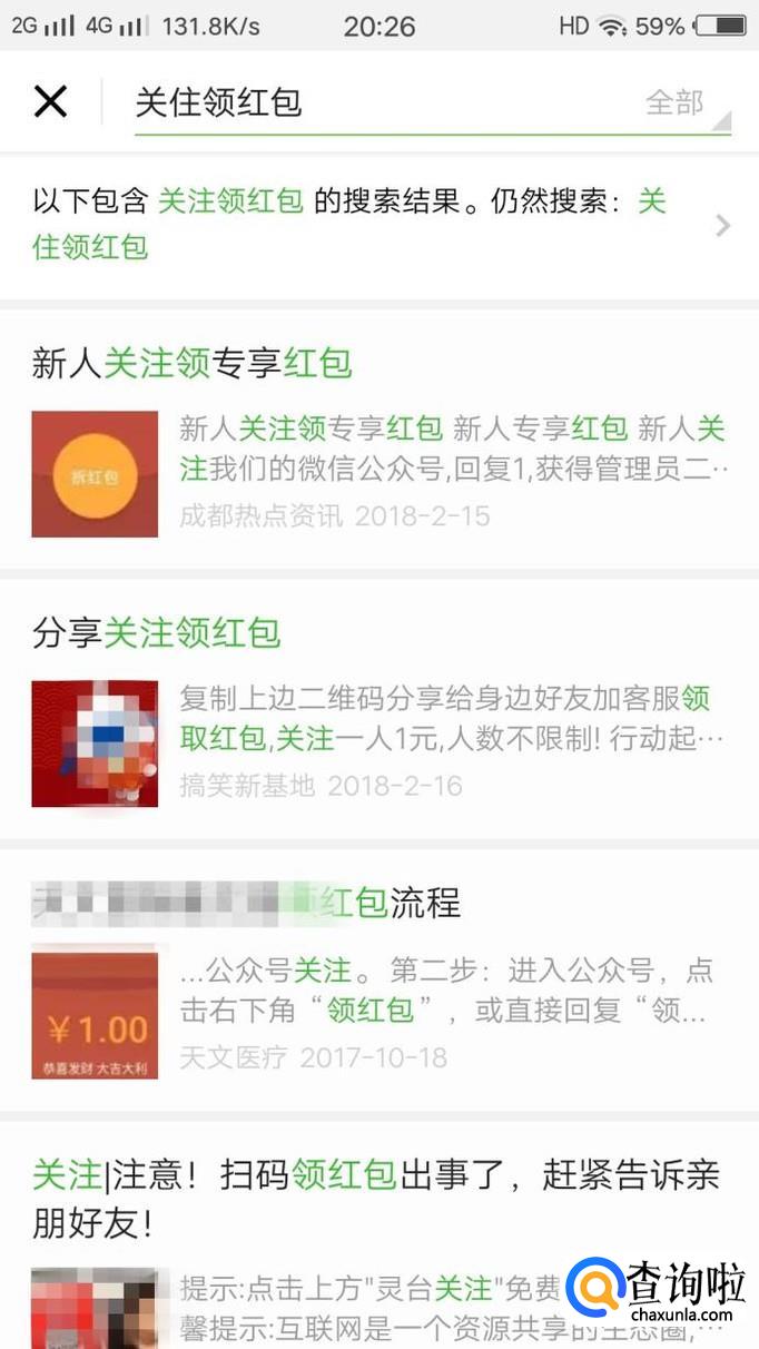 进入搜索页面后,搜索”关注领红包“等类似的关键词,点击搜索,显示搜索结果,如图所示。