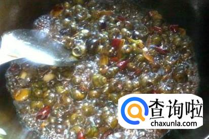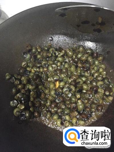 然后我们用郫县豆瓣酱和葱姜蒜和青椒炒制,然后把煮好的清明螺放入锅里面煸炒,然后用水闷一下就可以出锅了。