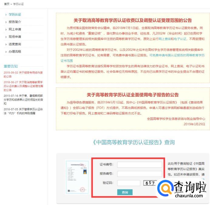 在弹出来界面中根据提示输入证书编号、报告编号和验证码就可以查询啦。