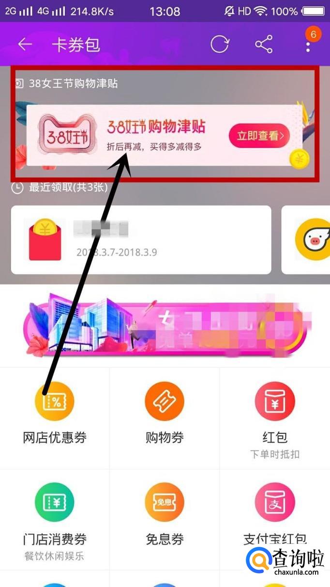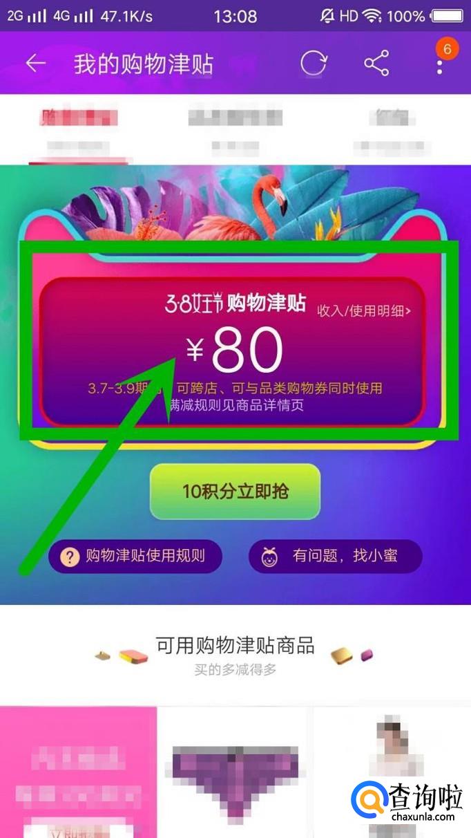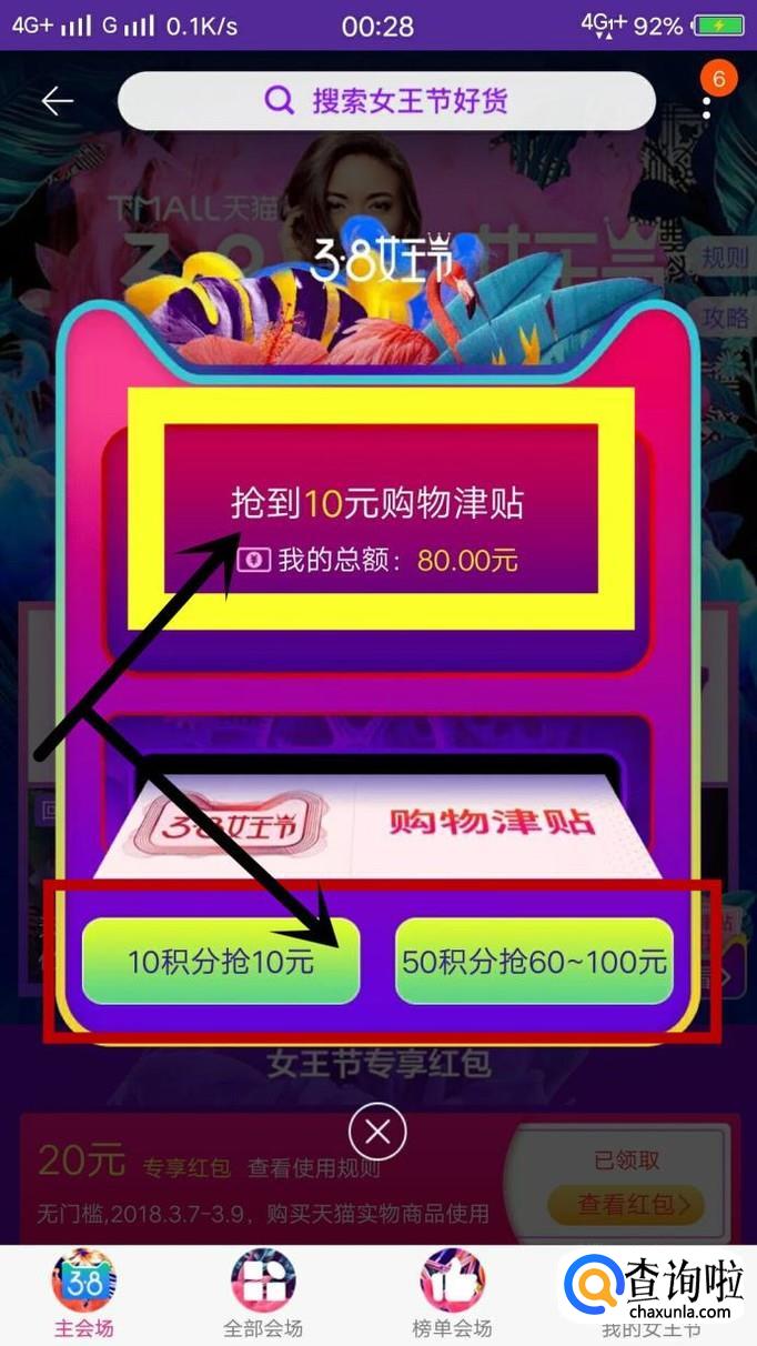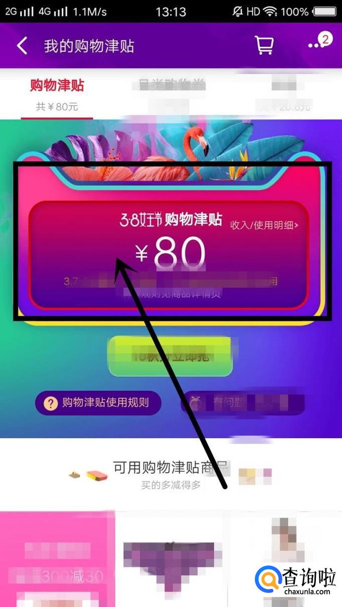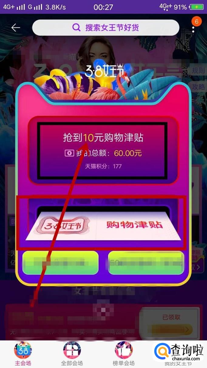 在“女王节专享红包”右下方会有“购物津贴3.8女王节”字样,点击查看,就可以看到天猫补贴给用户的购物金额,如图所示。