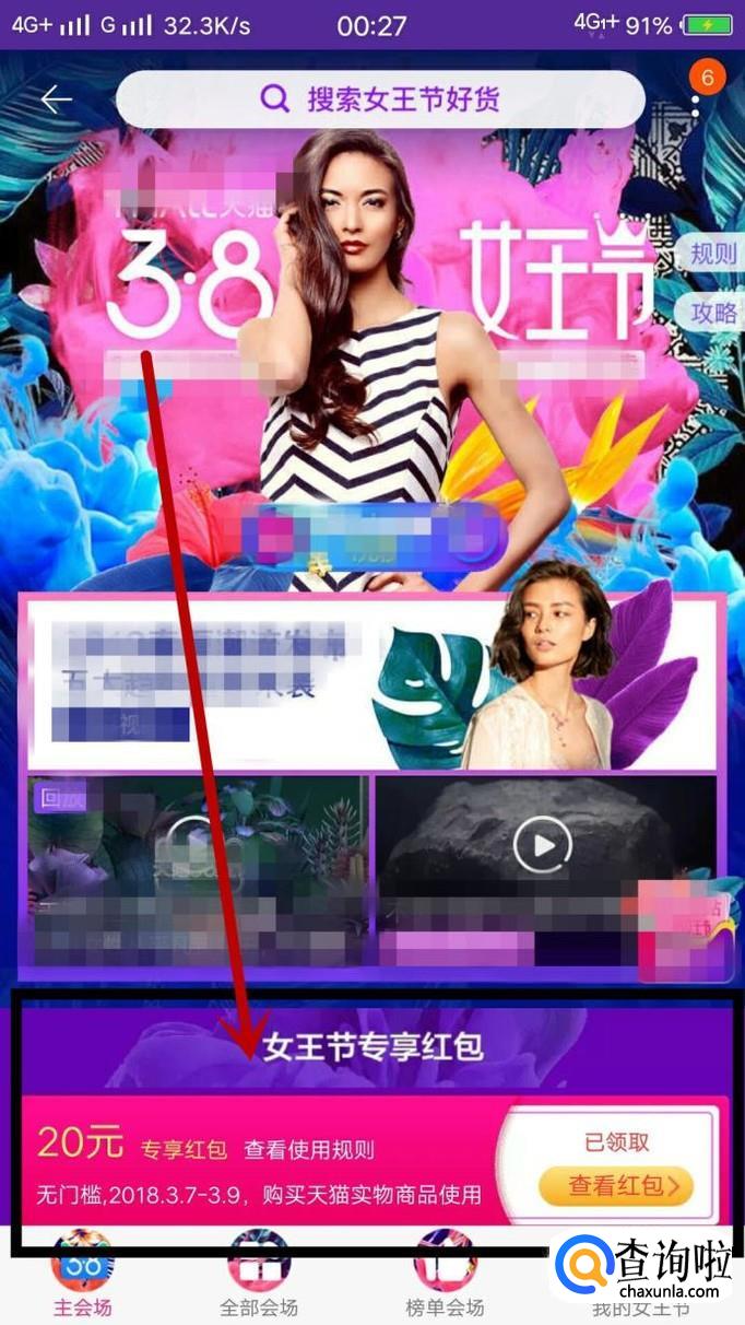 进入主会场后,有些满足条件的用户会看到“女王节专享红包”领取的页面,如图所示。