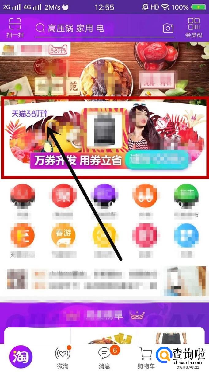 打开淘宝进入淘宝的首页面,我们就能看到3.8女王节的活动,如图所示。