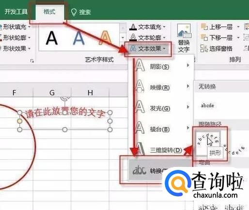 这时选取艺术字体,将字体样式设置为拱形
