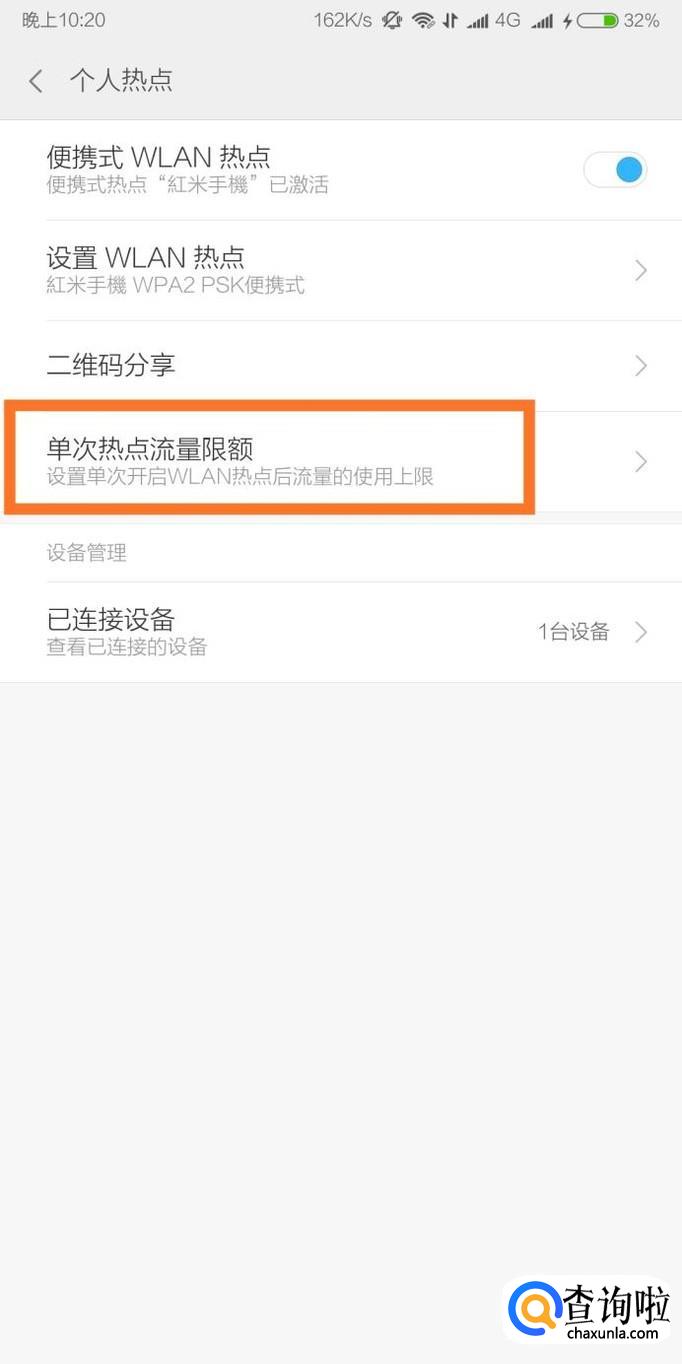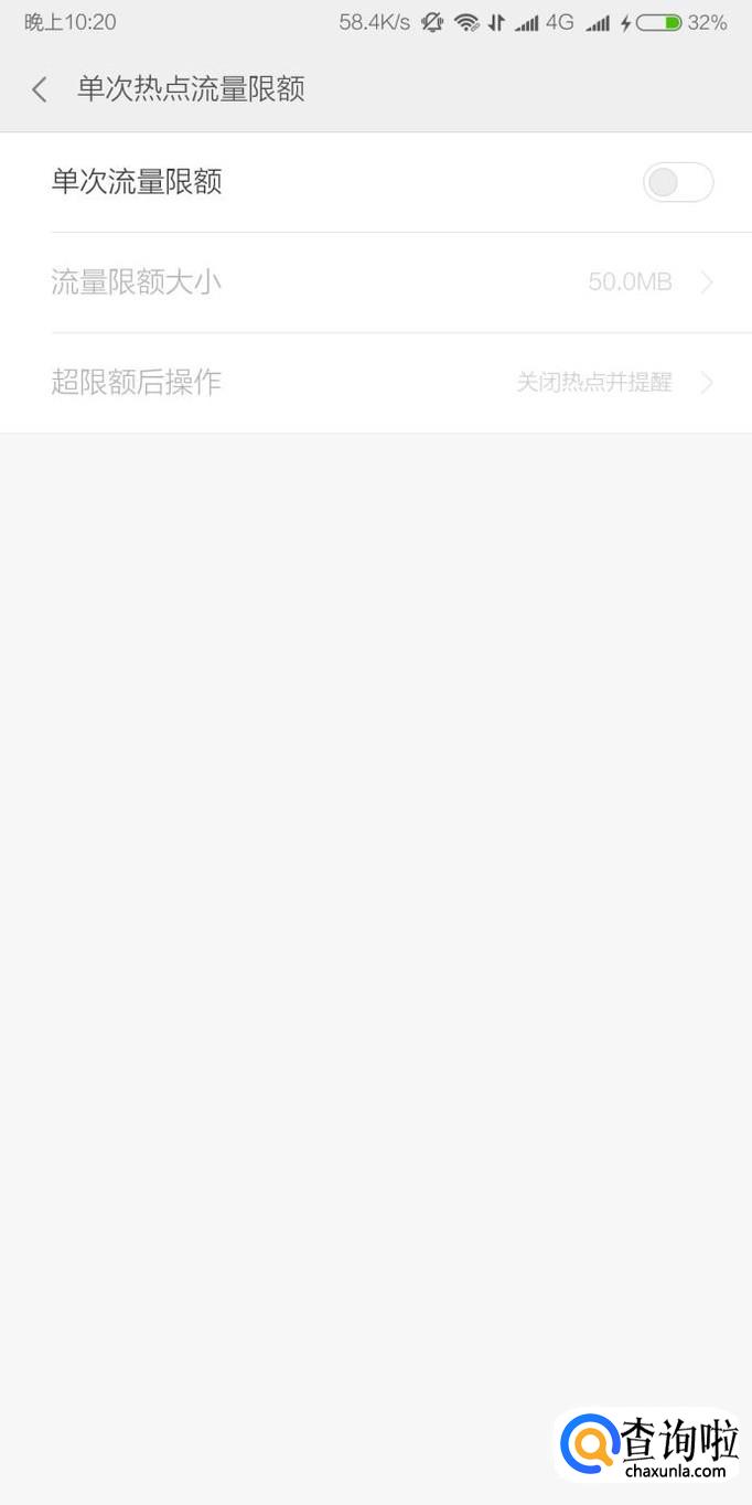 为了避免手机流量被超额使用,可以进入“单次热点流量限额”,设置开启WIFI后流量使用的上限。