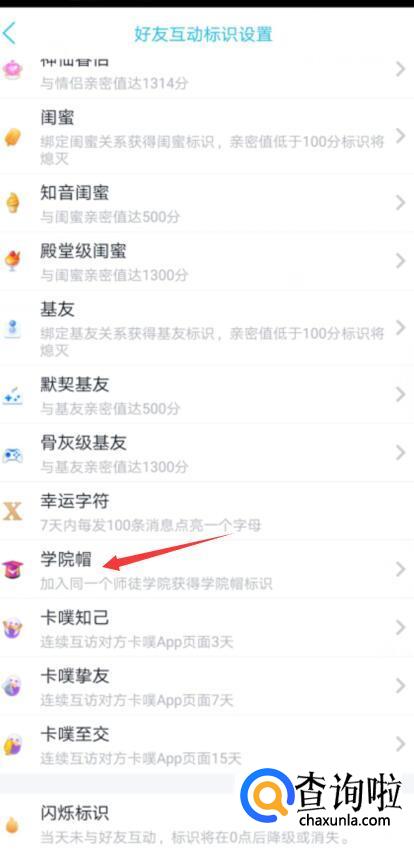 在好友互动标识设置页面,找到学院帽,并且点击。