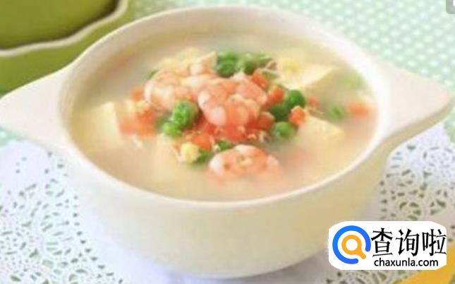 虾仁,豆腐,胡萝卜放在一起炖汤。喜欢吃蔬菜可以加在一起。