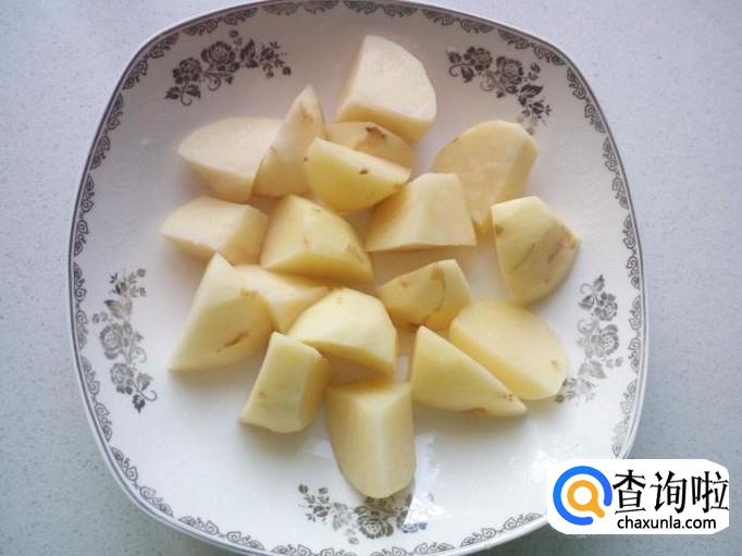 土豆去皮,用水清洗干净,控干水分,切成块(土豆没有茄子那么容易炖烂,所以块切的稍小些)。