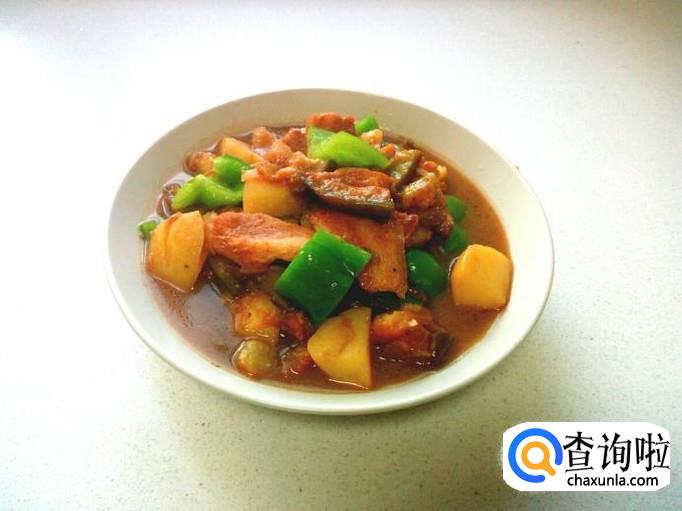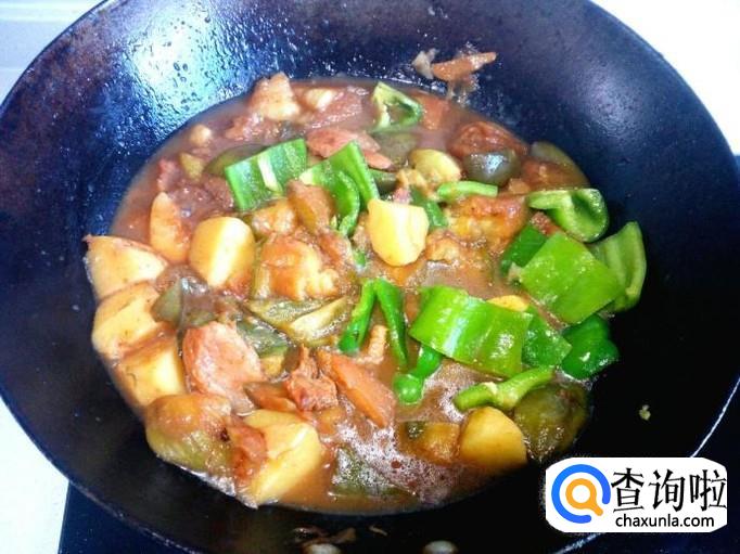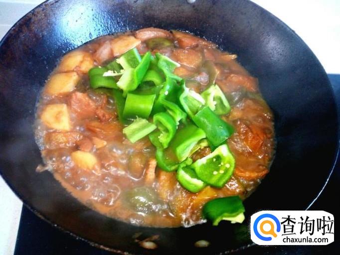 炖至少量汤时,用筷子插一下土豆(如果没炖烂糊,少添加水,再炖一会),土豆炖烂糊后,放入青椒,略翻一下,放入味精,关火(不要把汤汁炖干,留一些汤汁)。