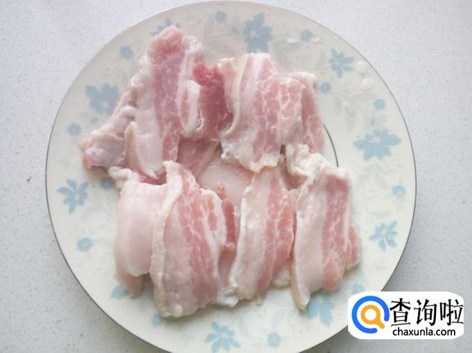 五花肉切成0.3公分左右厚的片。尽量用肥一些的肉,茄子和土豆比较吃油,油少也不好吃。