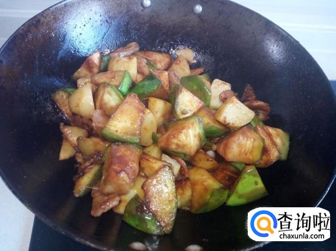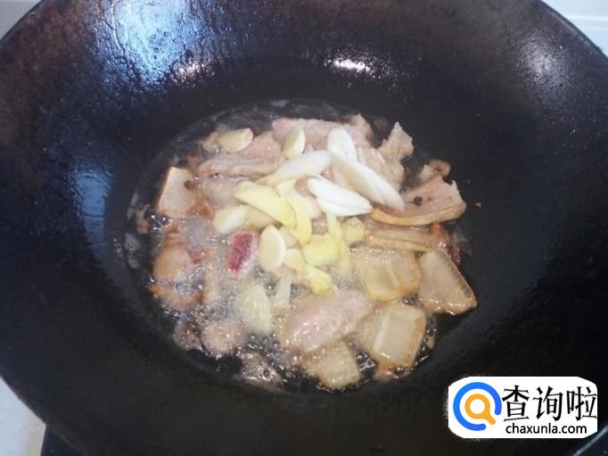 肉多炒一会,让肉下些猪油。然后放入葱,姜,蒜翻炒,随即放入土豆。