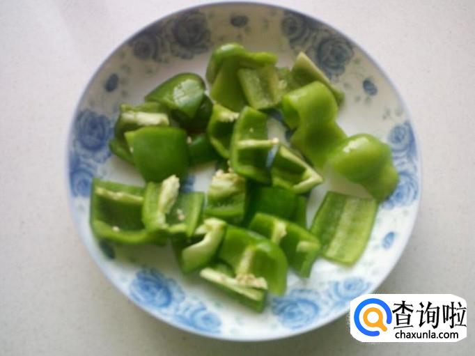 青椒用水清洗干净,控干水分,切成和茄子土豆大小差不多的块(青椒起到很好的提味作用,一定要放)。