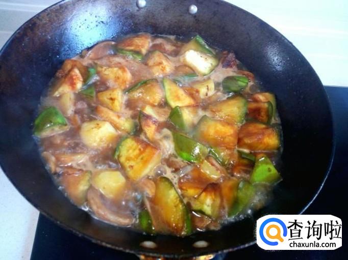 炒至土豆,茄子变软,上色后,放入水,水和茄子土豆一平(不要一次性的过多放入水,炖的时候,如果感觉水少,逐渐添加)。大火烧开,转小火慢炖。