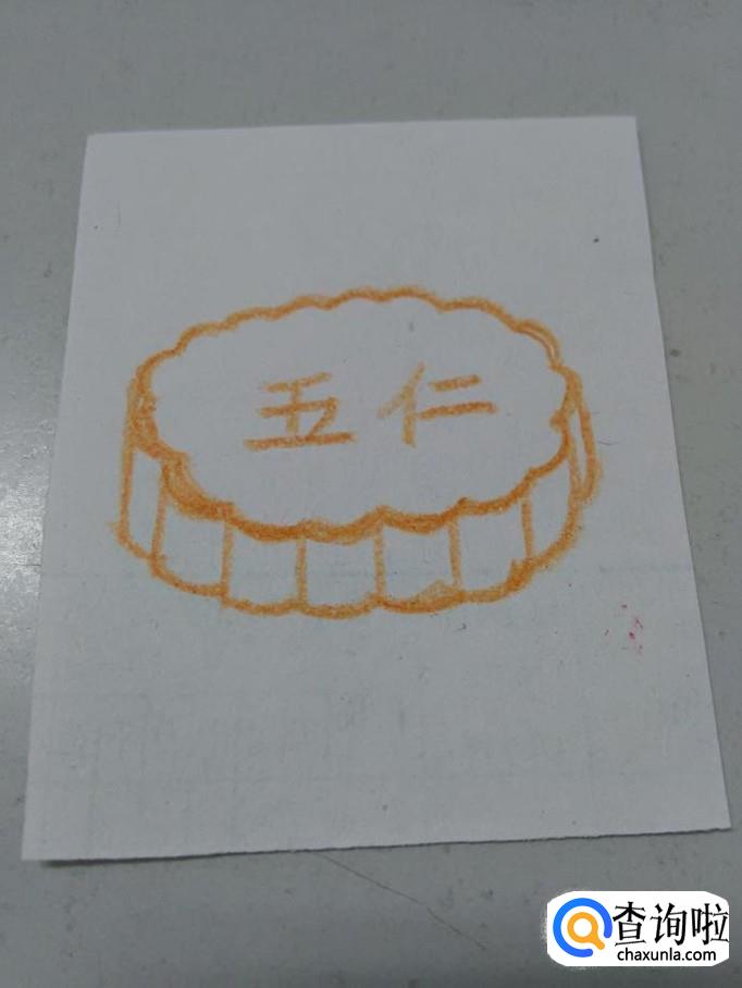 用笔在椭圆形中间写上五仁两个字,表示这是五仁月饼。