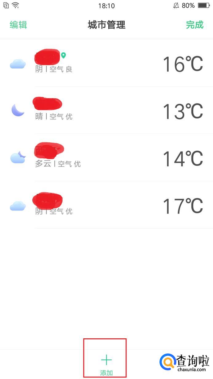 最后是自动定位问题,如果是无法定位,我们打开天气预报界面,找到城市管理界面,添加城市,上方自动定位打开即可。