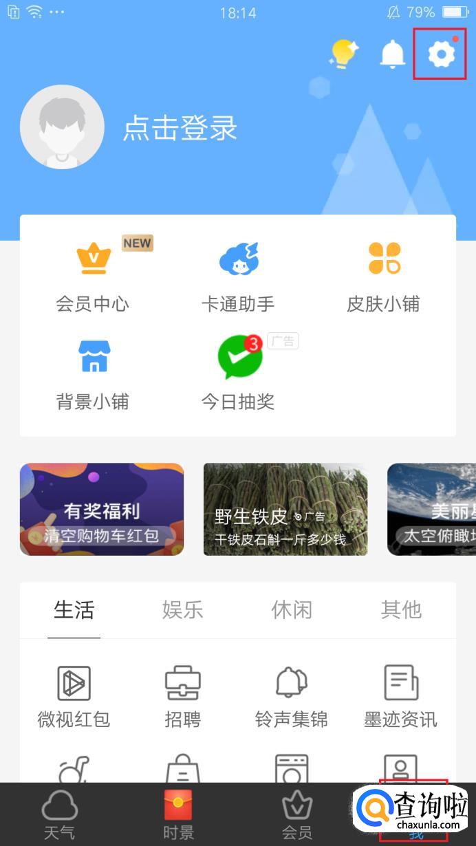 如果我们使用的是自行下载的软件,比如墨迹天气,我自己使用的,首先打开该软件,找到【我】,点击设置,如图所示。