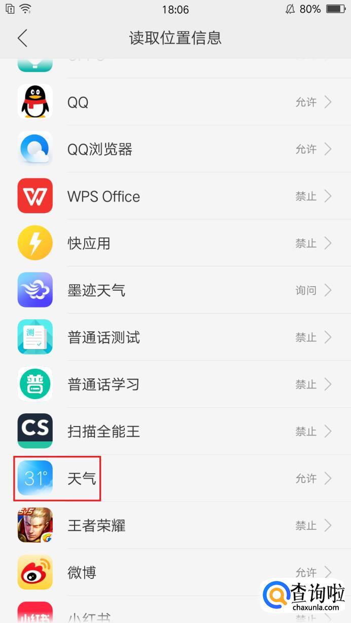 接着我们需要确认是否有禁用软件网络权限,我们先打开你所用的手机系统管家,权限隐私,找到你天气软件看是否有禁用软件网络权限,如果紧张了改为允许即可,如图所示。