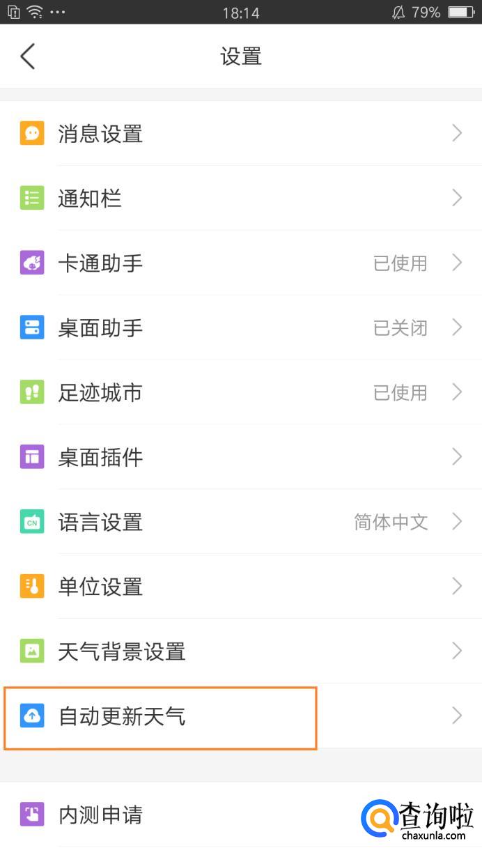 在设置中找到自动更新设置,点击它,查看是否为自动更新天气,如果没有,点击开启即可,如图所示。