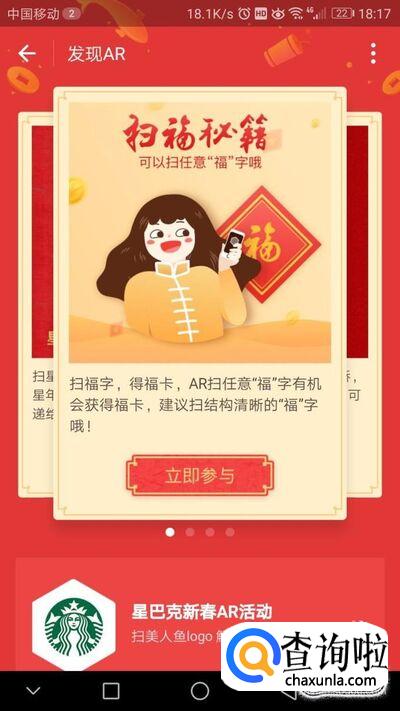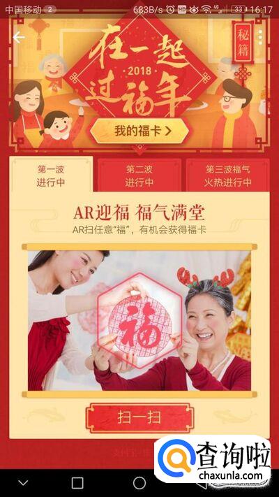 点击“第一波”,然后点击“扫一扫,进入后用AR扫任意“福”,就有机会获得福卡。扫描的“福”字可以是网页上搜索的图片、春联和商家广告牌上的,也可以在电脑上敲出“福”字然后放大字体,还可以自己用毛笔写,等等。