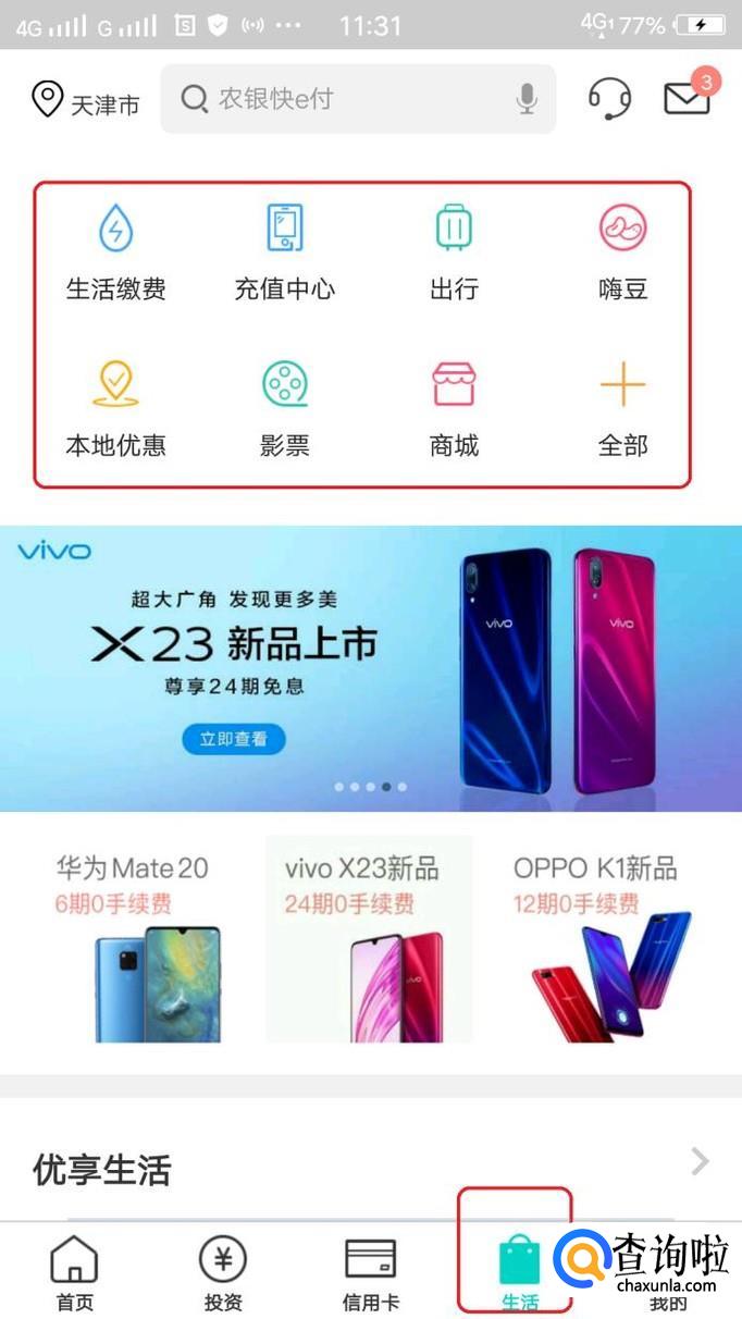 新版本的农行掌上银行还有生活服务选项,可以在上面进行生活缴费(视所在城市而定)、话费充值、买火车、飞机票、观影购票、购物等。