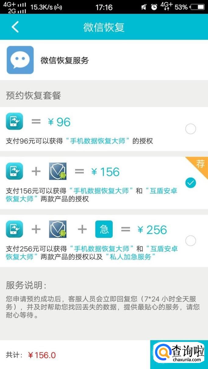 最后,选择相应的预约套餐,并且点击预约后付款,就等待客服人员帮助你恢复聊天记录即可。