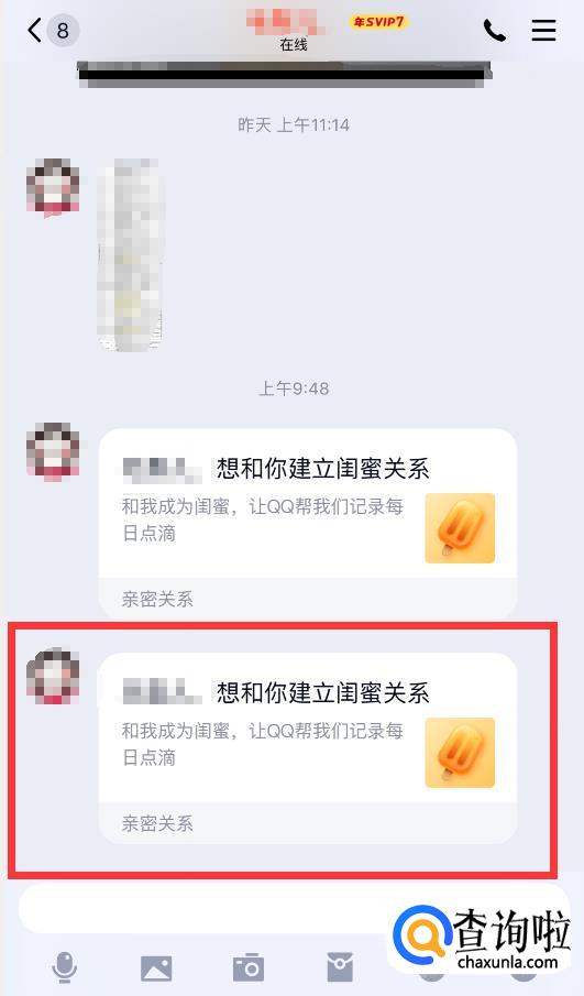 亲密关系建立成功后,双方联系人列表右侧都会有对应的图标显示,如下图所示的闺蜜图标。