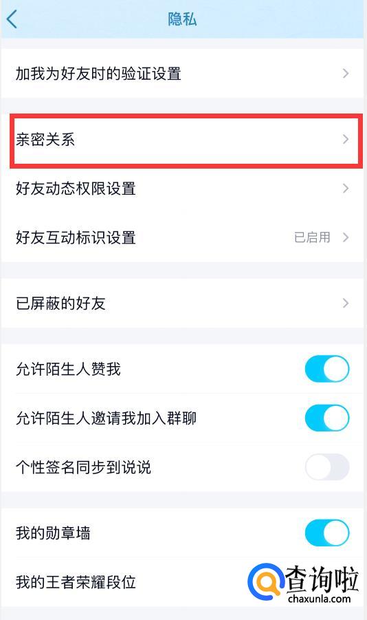 在隐私界面中,点击“亲密关系”。
