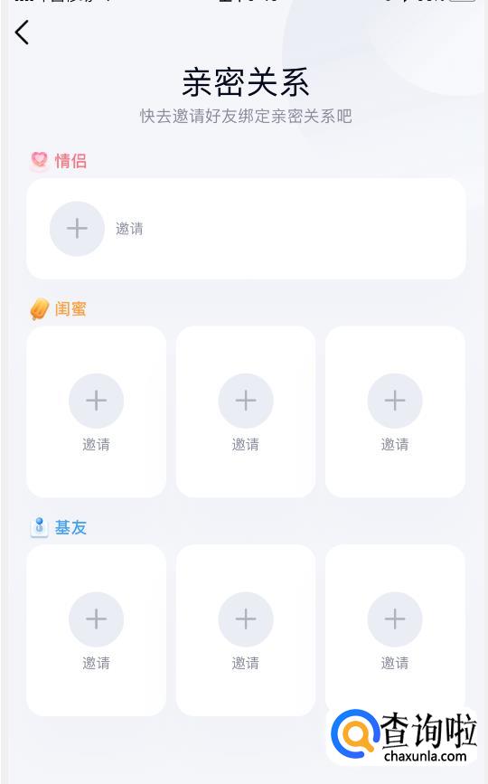 进入亲密关系详情页后,可以看到有多种亲密身份(情侣、闺蜜、基友),大家可以根据自己的需求来选择添加对应的亲密关系。所有亲密关系的建立方法都是一样的,此处以“闺蜜”为例。