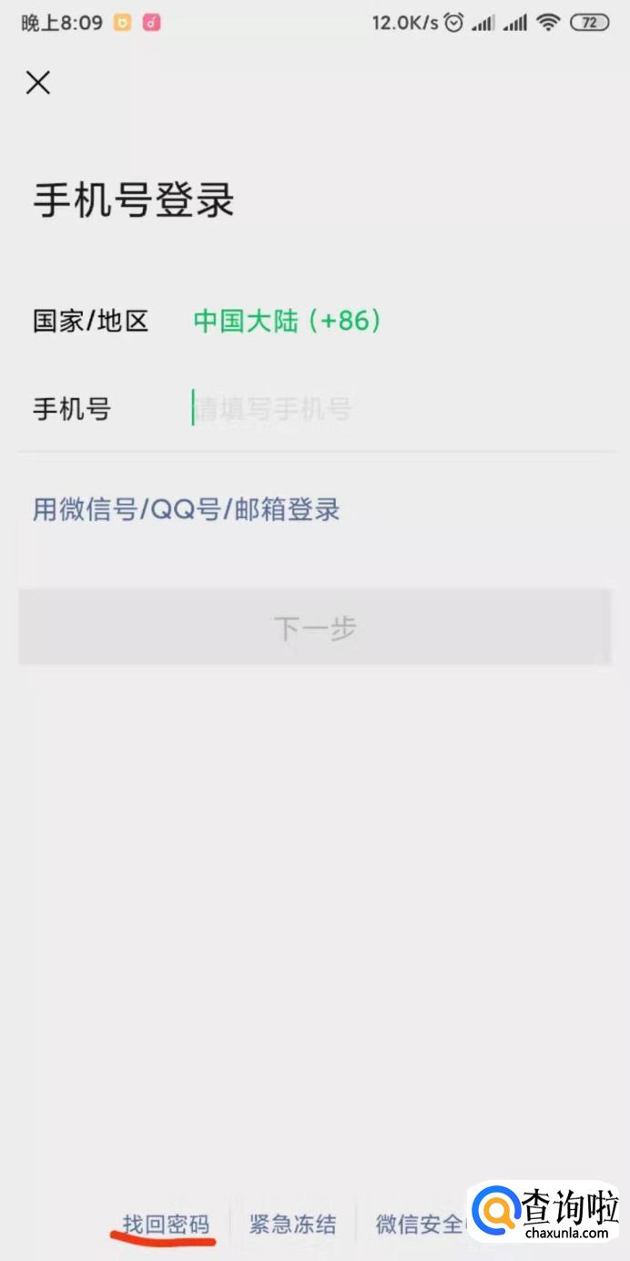首先打开微信,点击页面的“找回密码”。