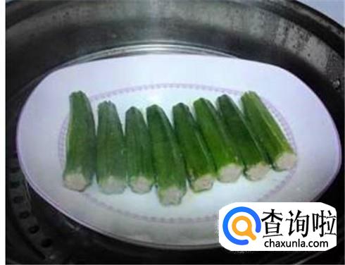 蒸锅里加上水,放上蒸格,把秋葵放在盘子里,放进蒸锅里蒸。