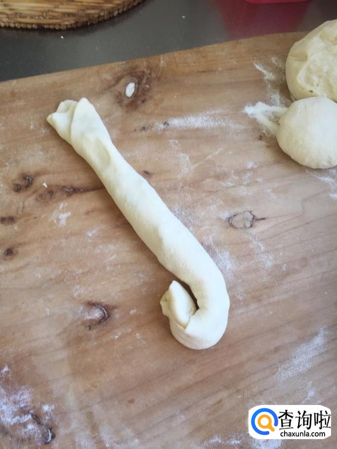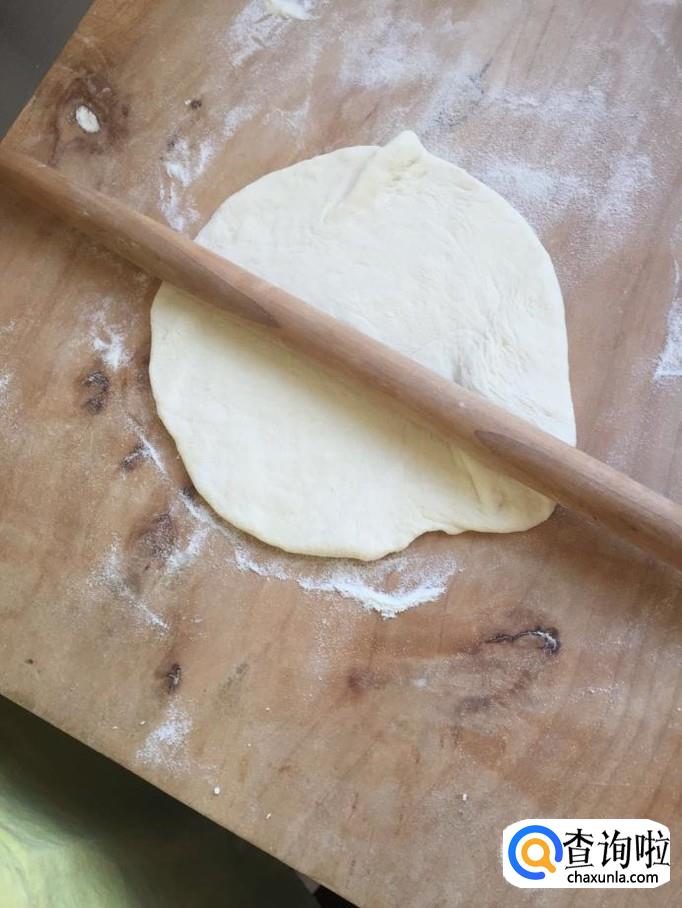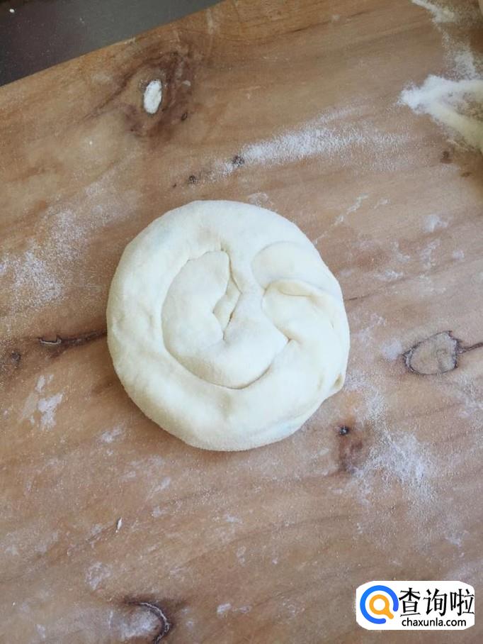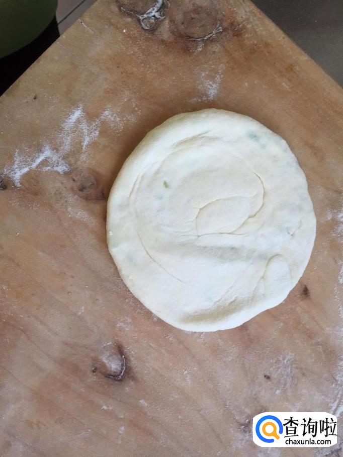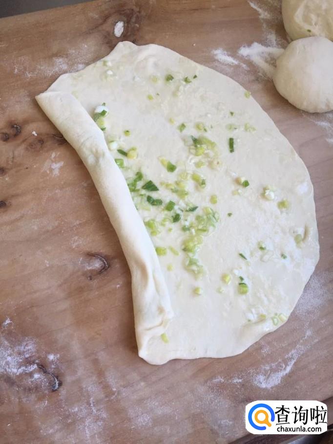 将葱,盐,油搅拌均匀铺开,把饼从一边卷起,卷成长条,再将长条卷成圆形,压成比较薄的饼