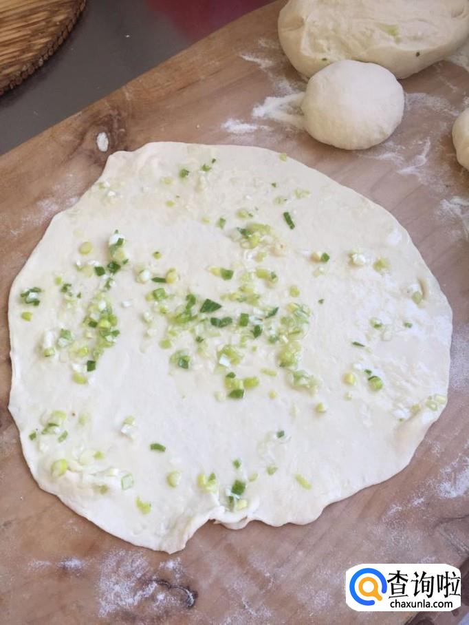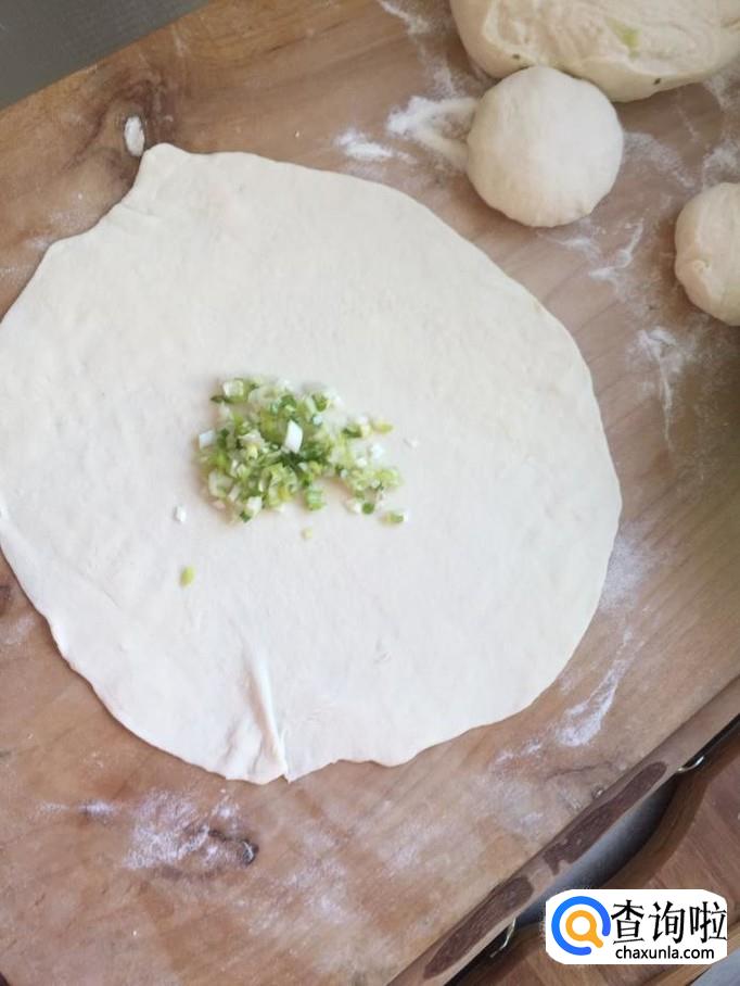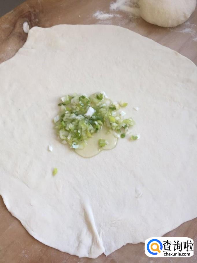 取一个分好的剂子,擀成薄饼,不需要太薄,放上切好的葱末,放点盐,油(豆油,花生油,调和油都可)