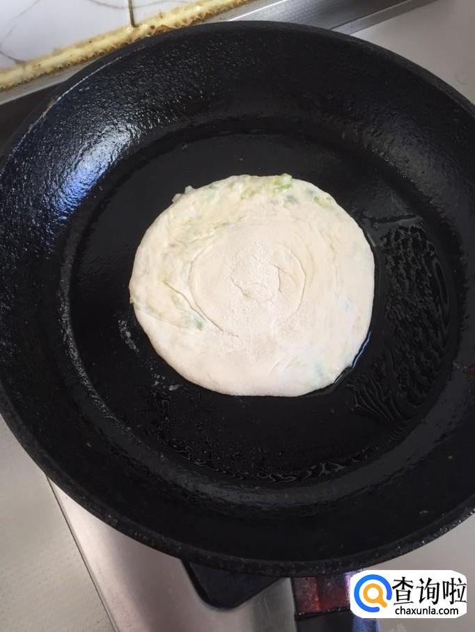 平底锅,放上油,中火,油微热就可以把做好的饼放进去,不必急着翻面,过一会等先放的那一面有些发黄了再翻即可,两面都黄橙橙就熟了。