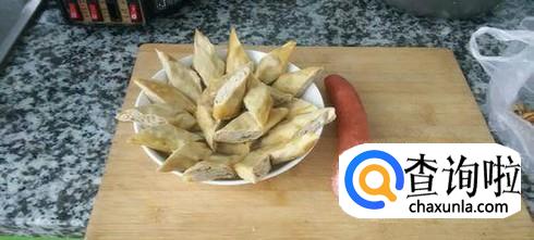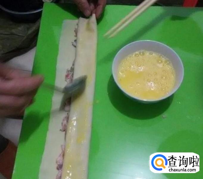 然后取一张干豆腐在水里过一下,铺在案板上。将肉馅均匀的抹在干豆腐上,一边不要抹完,就一小节出来,然后从另一边卷起来,卷到没肉的地方,再取适量的鸡蛋抹在上边,最后把它全部卷起来。