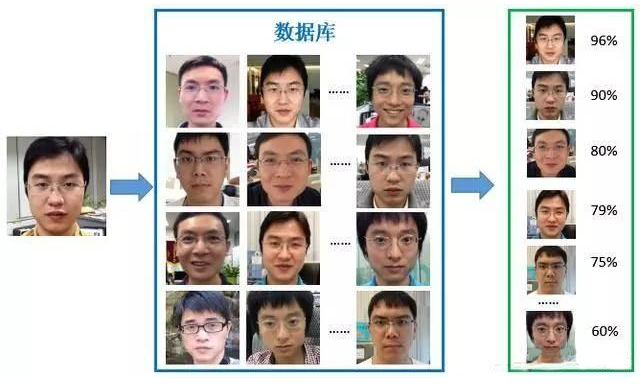 人脸检索通过将输入的人脸和一个集合中的说有人脸进行比对,根据比对后的相似度对集合中的人脸进行排序。根据相似度从高到低排序的人脸序列即使人脸检索的结果。