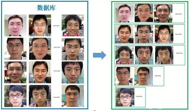 人脸聚类过程(右侧绿框内按身份的分组结果为聚类结果)