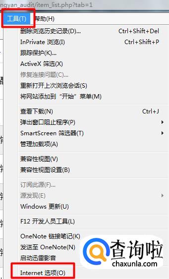 打开IE浏览器,找到(工具栏),在出现的下拉菜单中找到(internet选项),进入,如图。