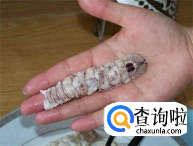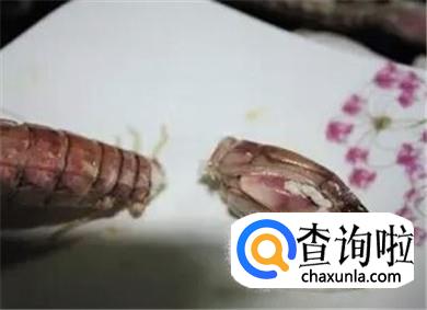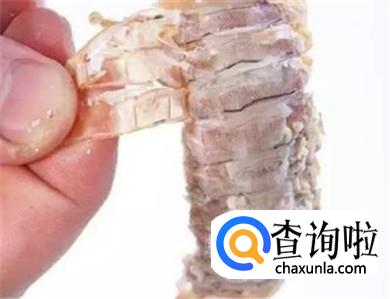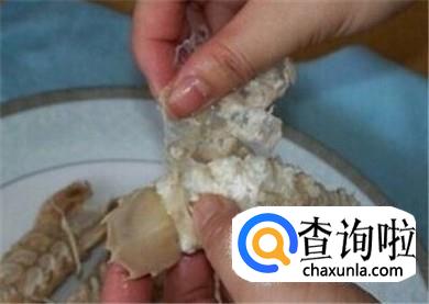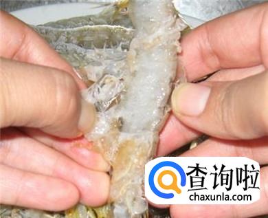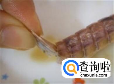 再用手轻轻地揭去腹部的皮。现在只剩尾部的肉在壳里了。