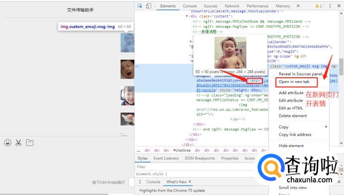 将鼠标移动到想要保存的表情上,右侧代码框将代表表情的代码变成蓝色,鼠标移动到代码蓝色框内,在“src”属性后方的链接,就是代码的位置,点击鼠标右键,选择“open in new tab”在新标签页打开表情。