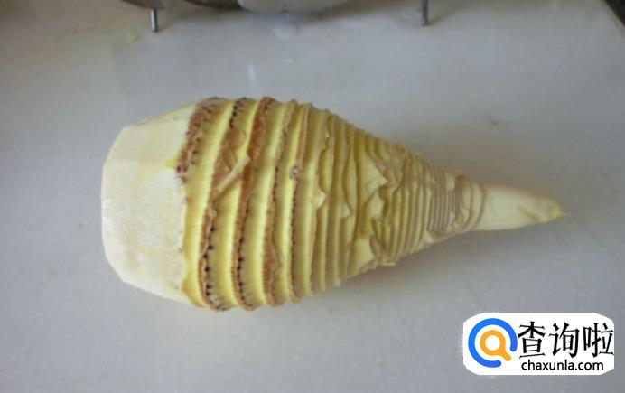 接着再在竹笋上竖着划一刀,直到露出白色的竹笋皮,深一点,多划几刀,但注意也不要太深,不要划破里面的竹笋肉。