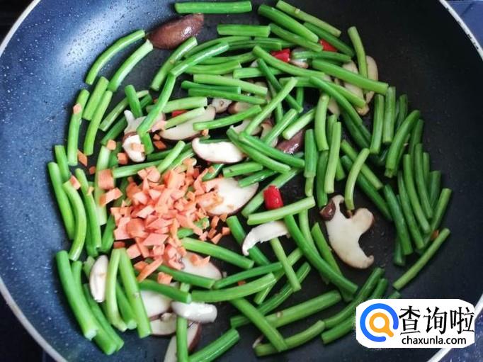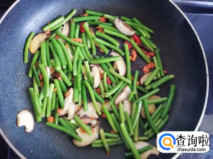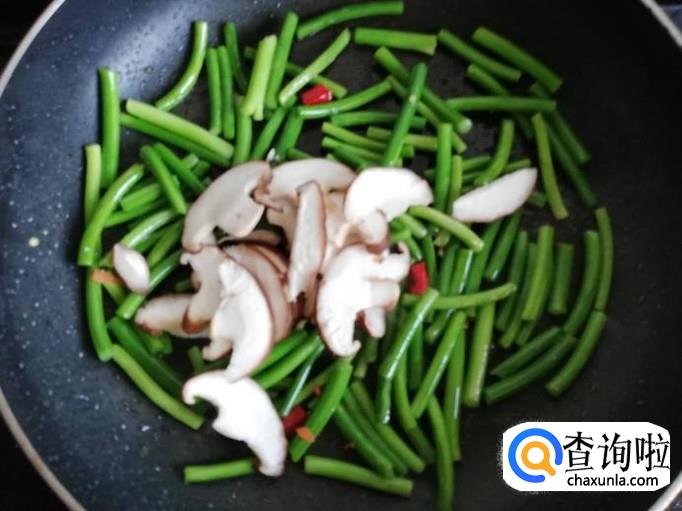 蒜薹炒断生后,香菇放入锅中炒出香味