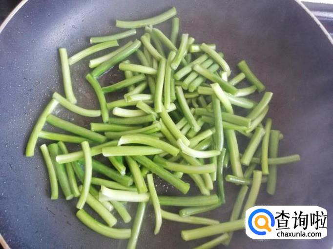 锅烧热,加入适量油,油温热时把蒜薹放入锅中翻炒