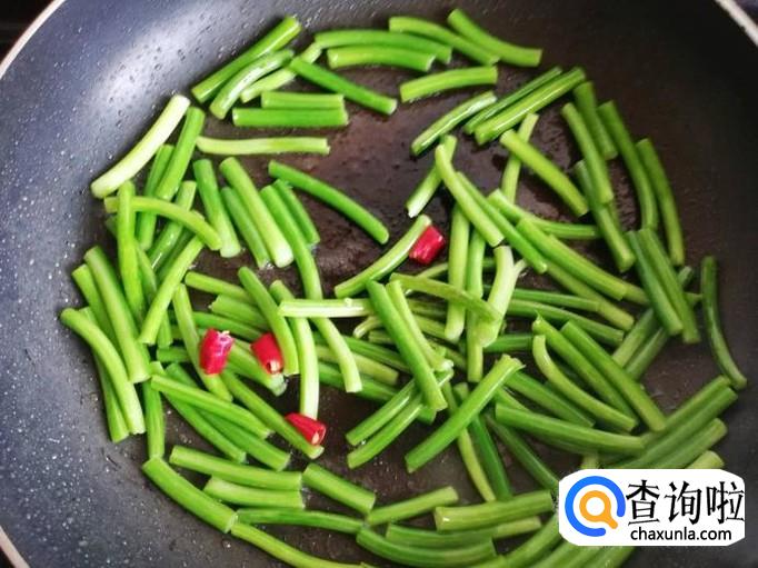 蒜薹炒至颜色变翠绿时,辣椒放入锅中