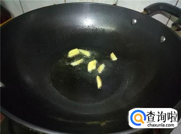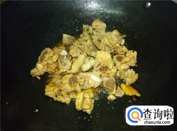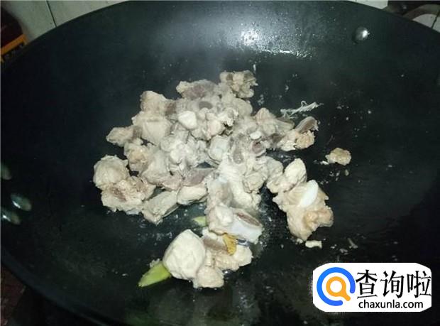 热锅下油,放入姜片煸香,然后倒入烫过水的排骨,快速翻炒均匀。