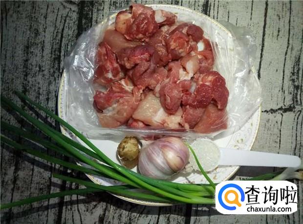 准备好所有原材料:新鲜的猪小排一根、香葱两根、蒜头和姜适量、白糖适量。